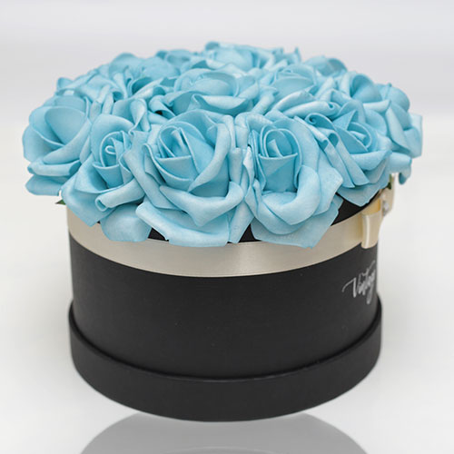 Handmade 16 pieces Athen rose box made of blue foam roses in a black box.