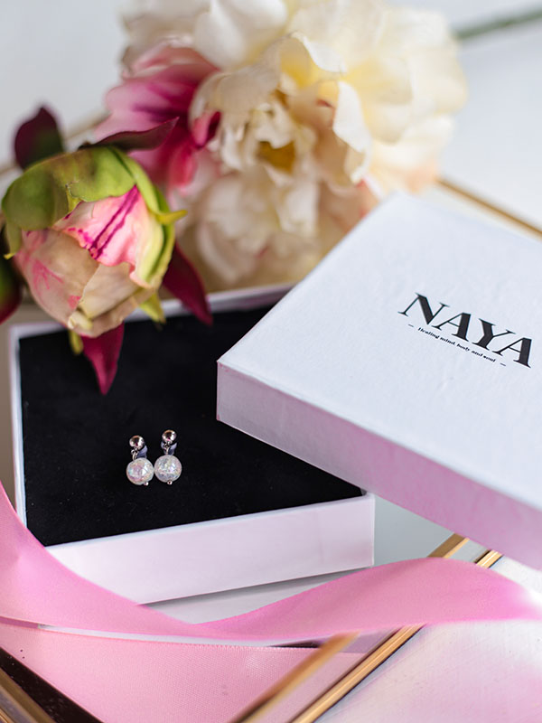 Dara angel aura quartz earrings with a NAYA jewellery gift box.