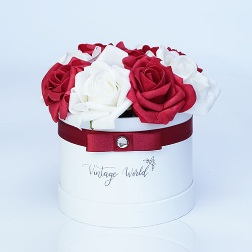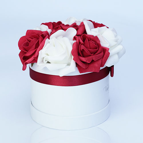 Handmade 9 pieces Debrecen rose box made of red and white foam roses in a white box.