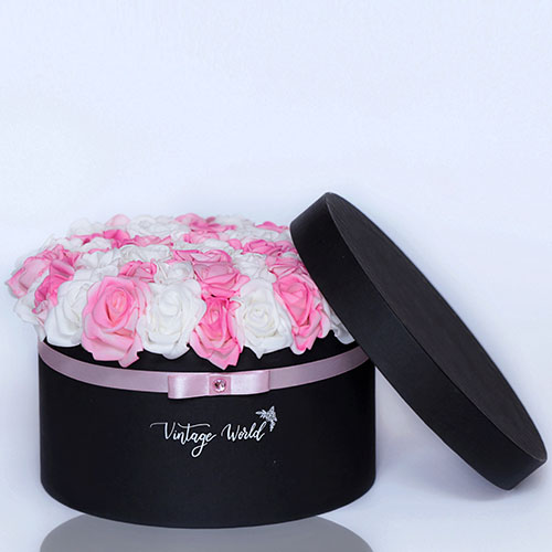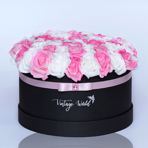 Handmade 50 pieces Hamburg rose box made of pink and white foam roses in a black box.