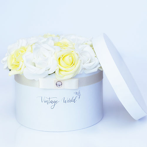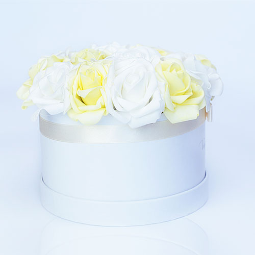 Handmade 16 pieces Kosice rose box made of yellow and white foam roses in a white box.