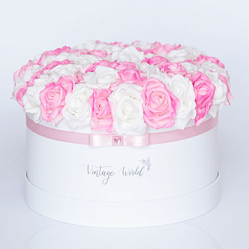 Handmade 35 pieces Miami rose box made of pink and white foam roses in a white box.
