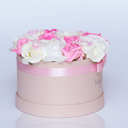 Handmade 16 pieces Milan rose box made of pink, white and half purple foam roses in a beige box.