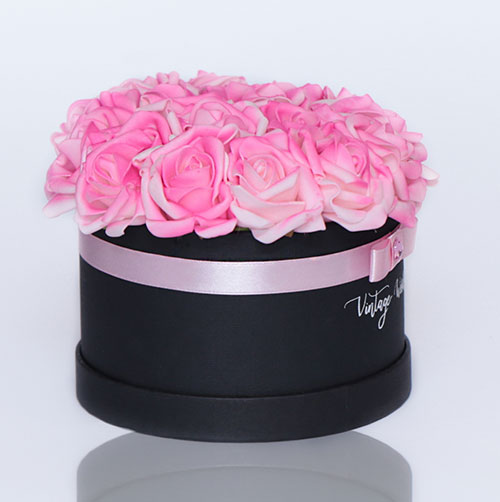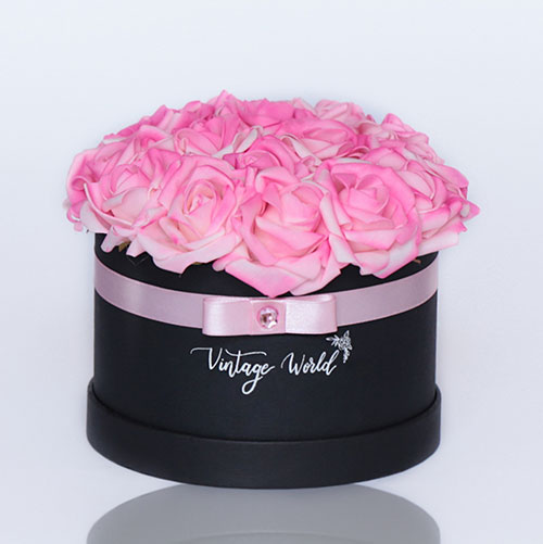 Handmade 16 pieces Moscow rose box made of pink foam roses in a black box.