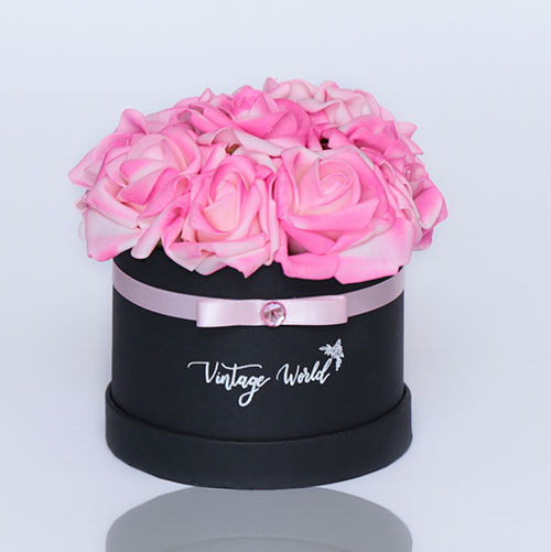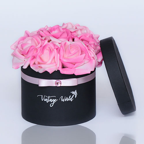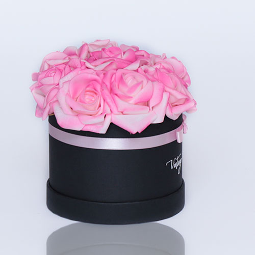 Handmade 9 pieces Moscow rose box made of pink foam roses in a black box.