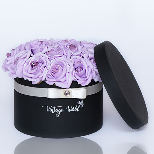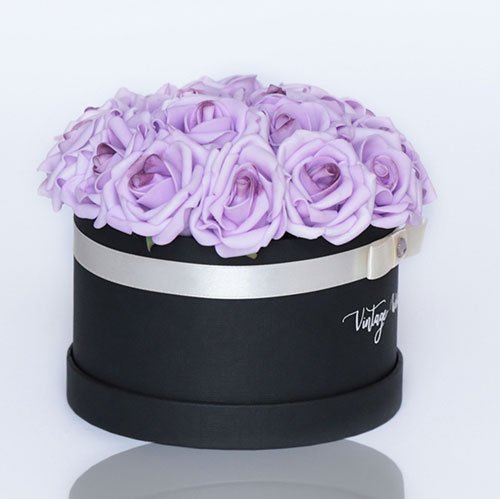 Handmade 16 pieces Cannes rose box made of purple foam roses in a black box.