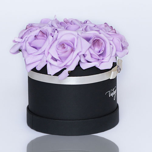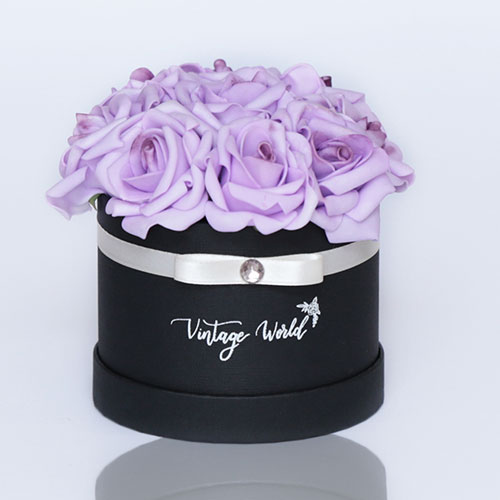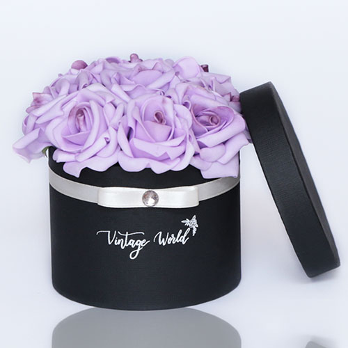 Handmade 9 pieces Cannes rose box made of purple foam roses in a black box.
