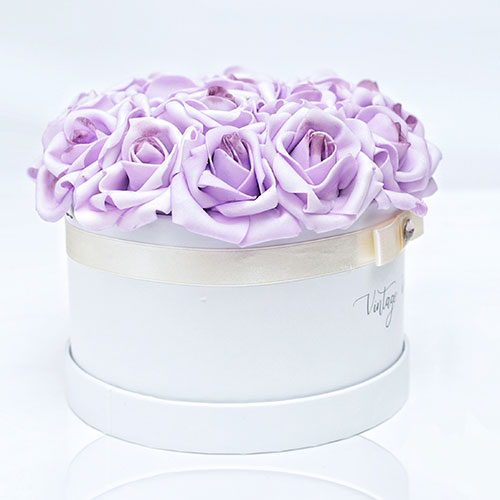 Handmade 16 pieces Provance rose box made of purple foam roses in a white box.