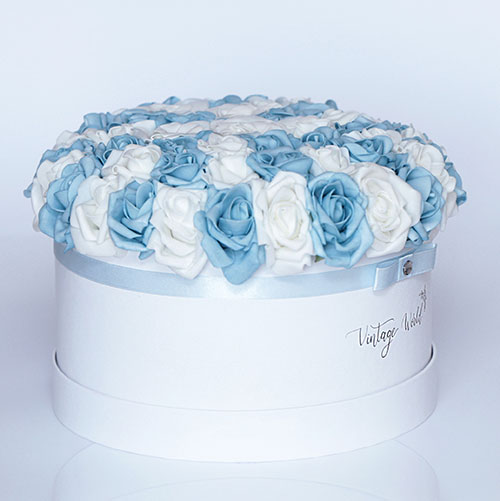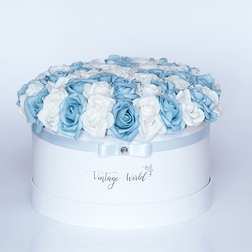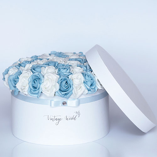Handmade 50 pieces Santorini rose box made of blue and white foam roses in a white box.