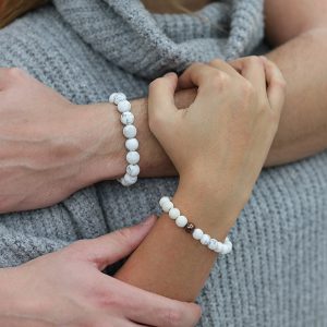Tabris howlit bracelets for couples in white. The bracelet for her has one extra charm.